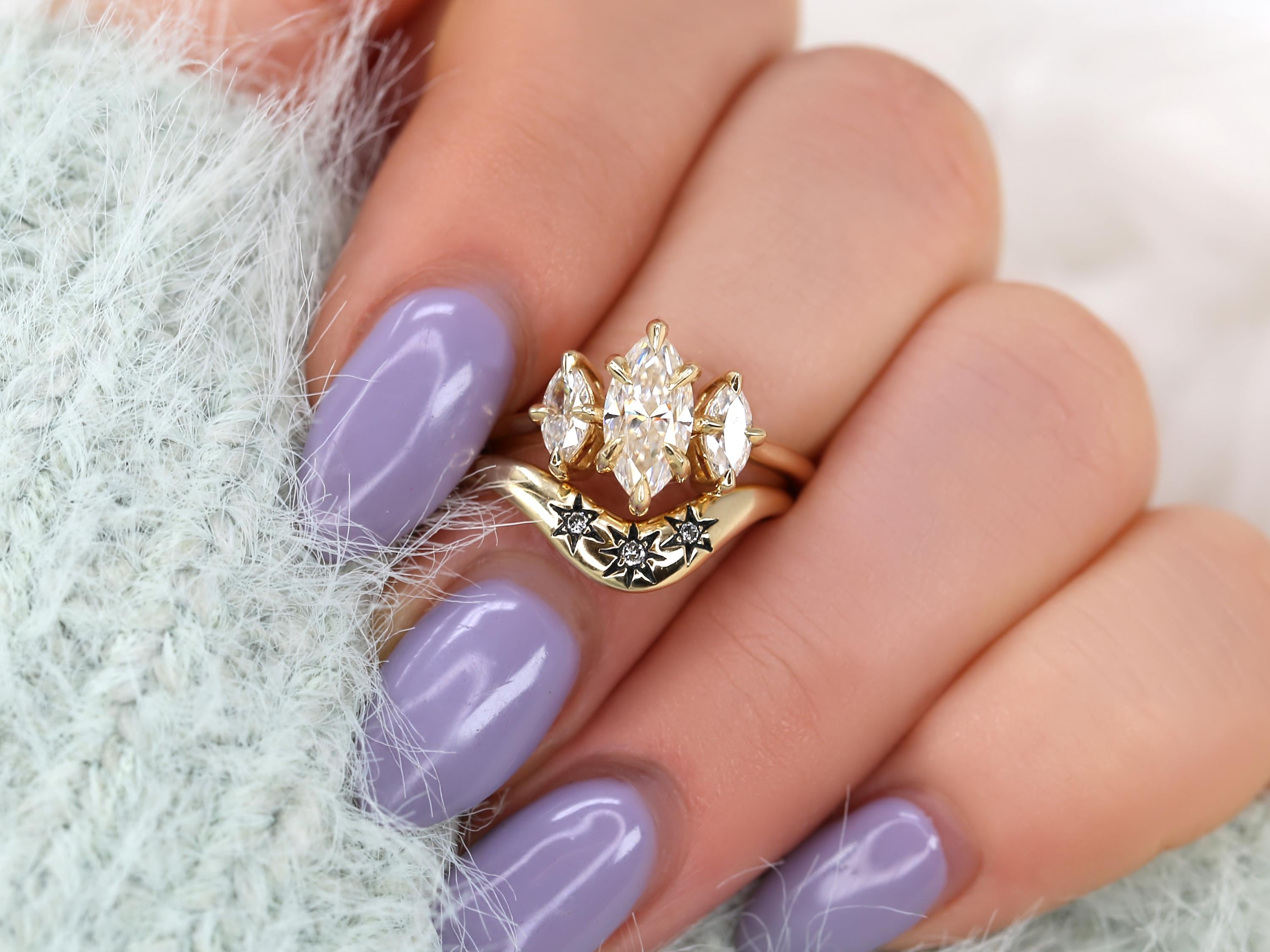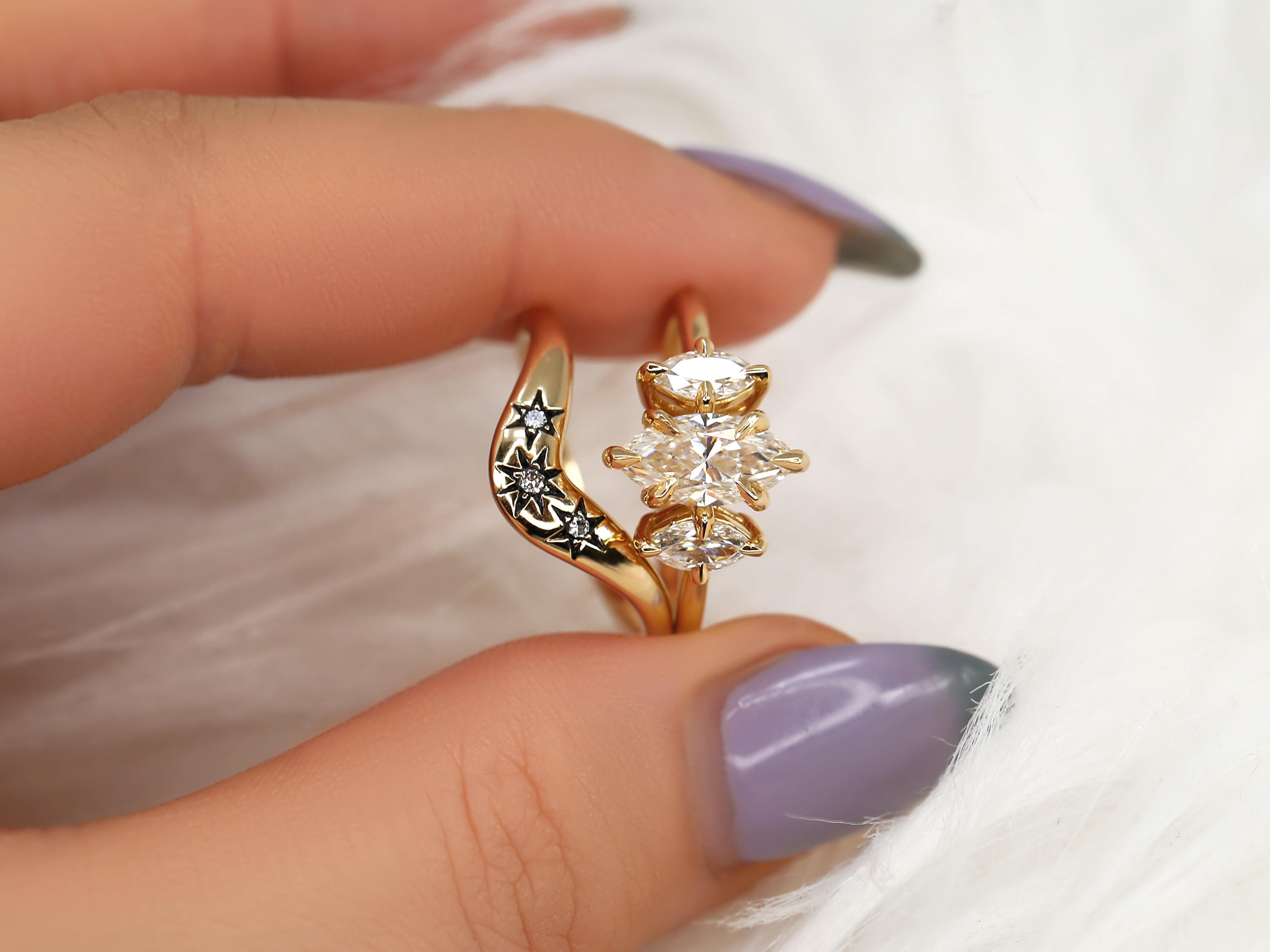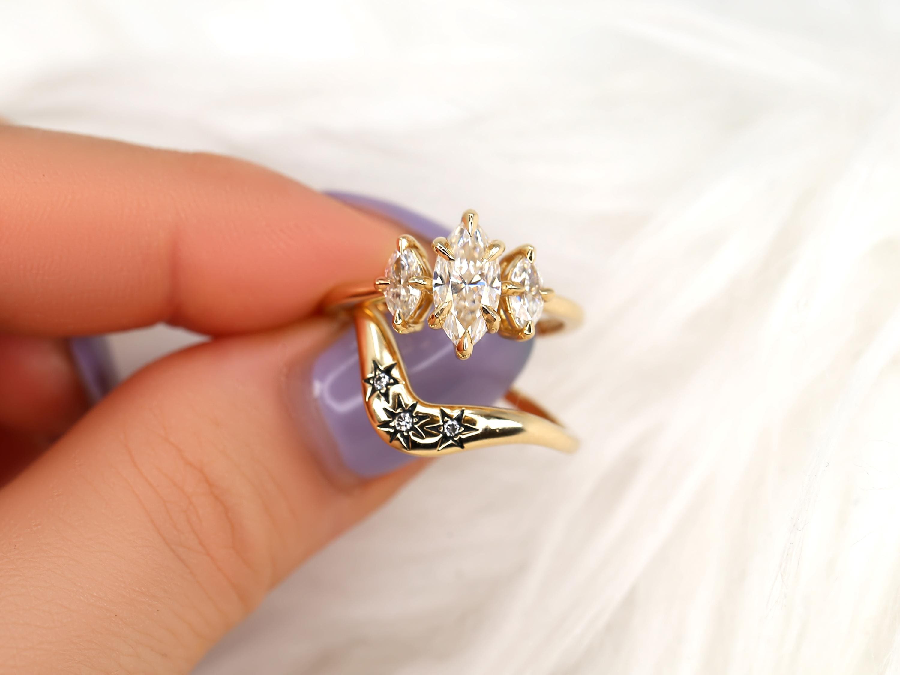 1.50ct Beckett 10x5mm & Ursa 14kt Moissanite Diamond Marquise Three Stone Bridal Set,Marquise Trilogy Wedding Ring Set,Unique Marquise Ring