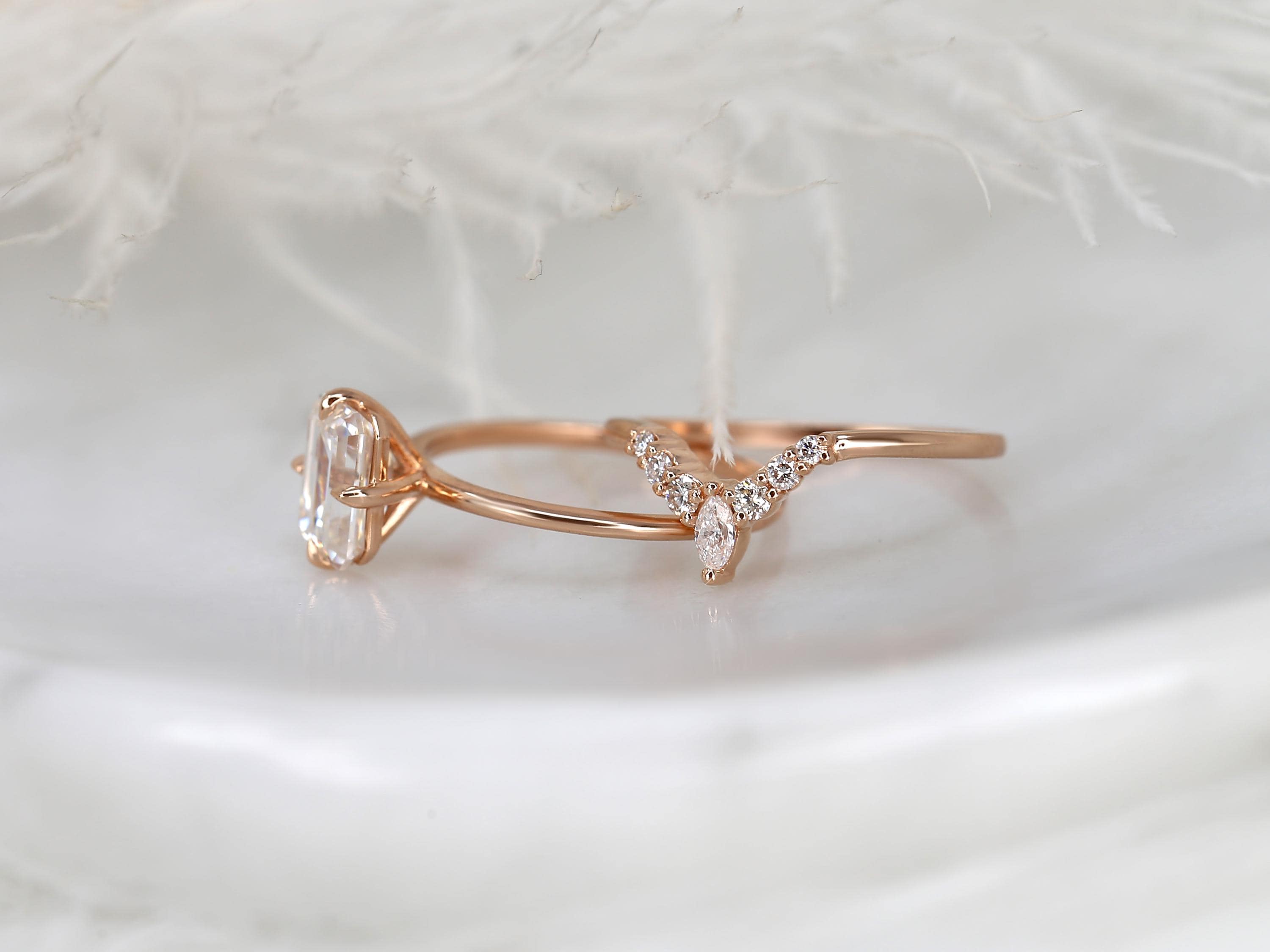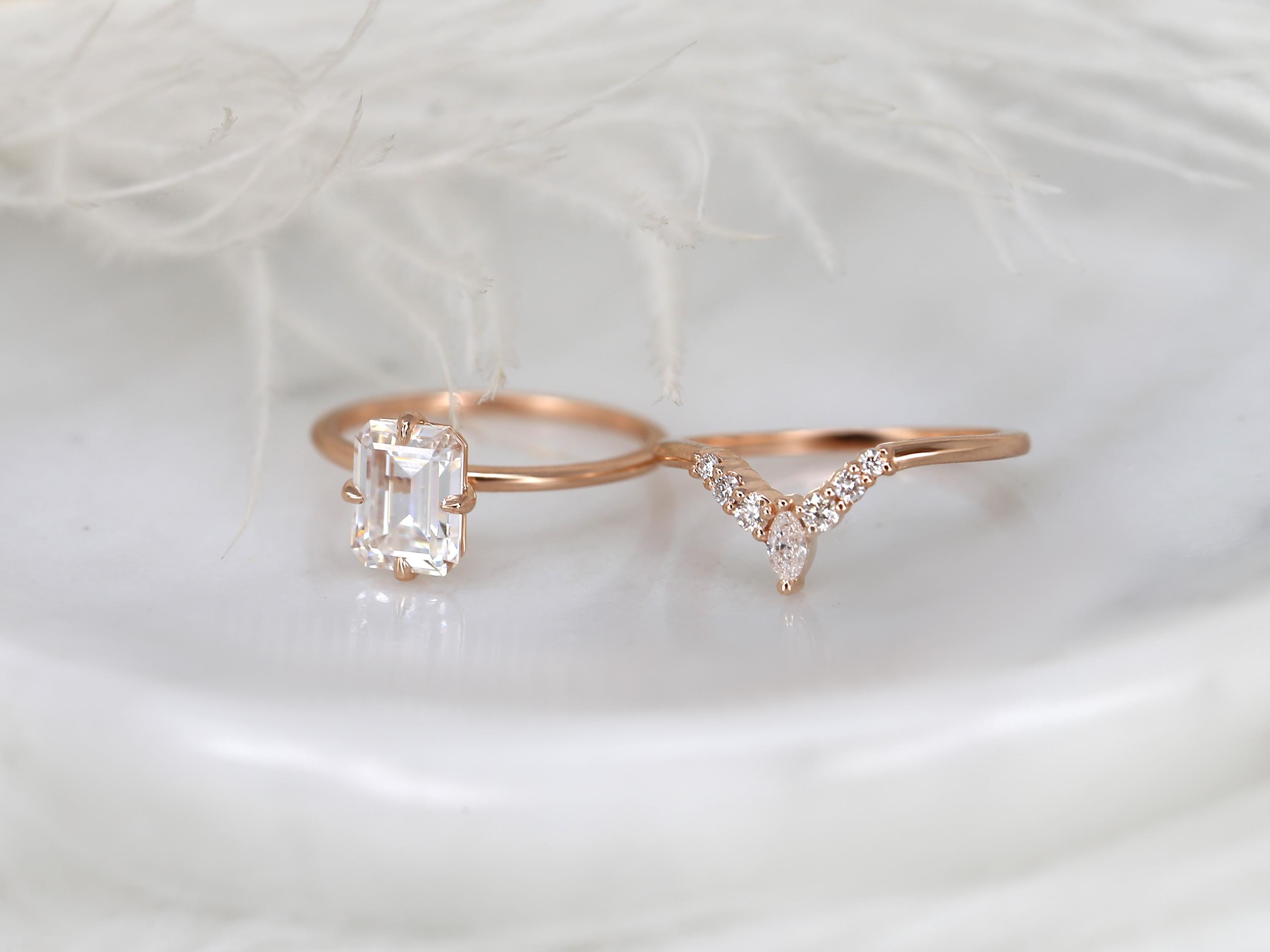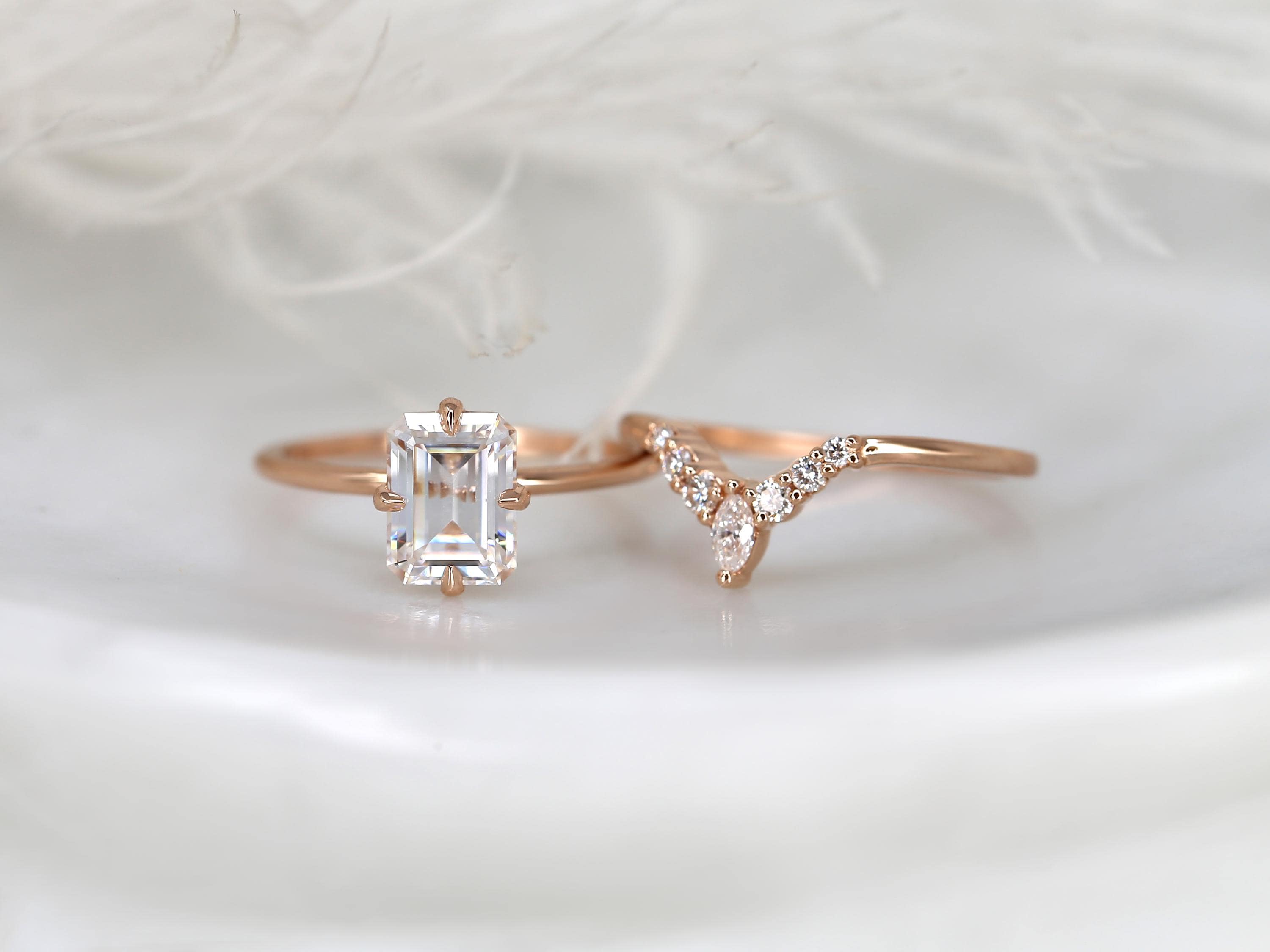 1.75cts Ruth 8x6mm & Kendall 14kt Moissanite Emerald Cut Solitaire Bridal Set,Minimalist Emerald Wedding Set,Unique Emerald Engagement Ring