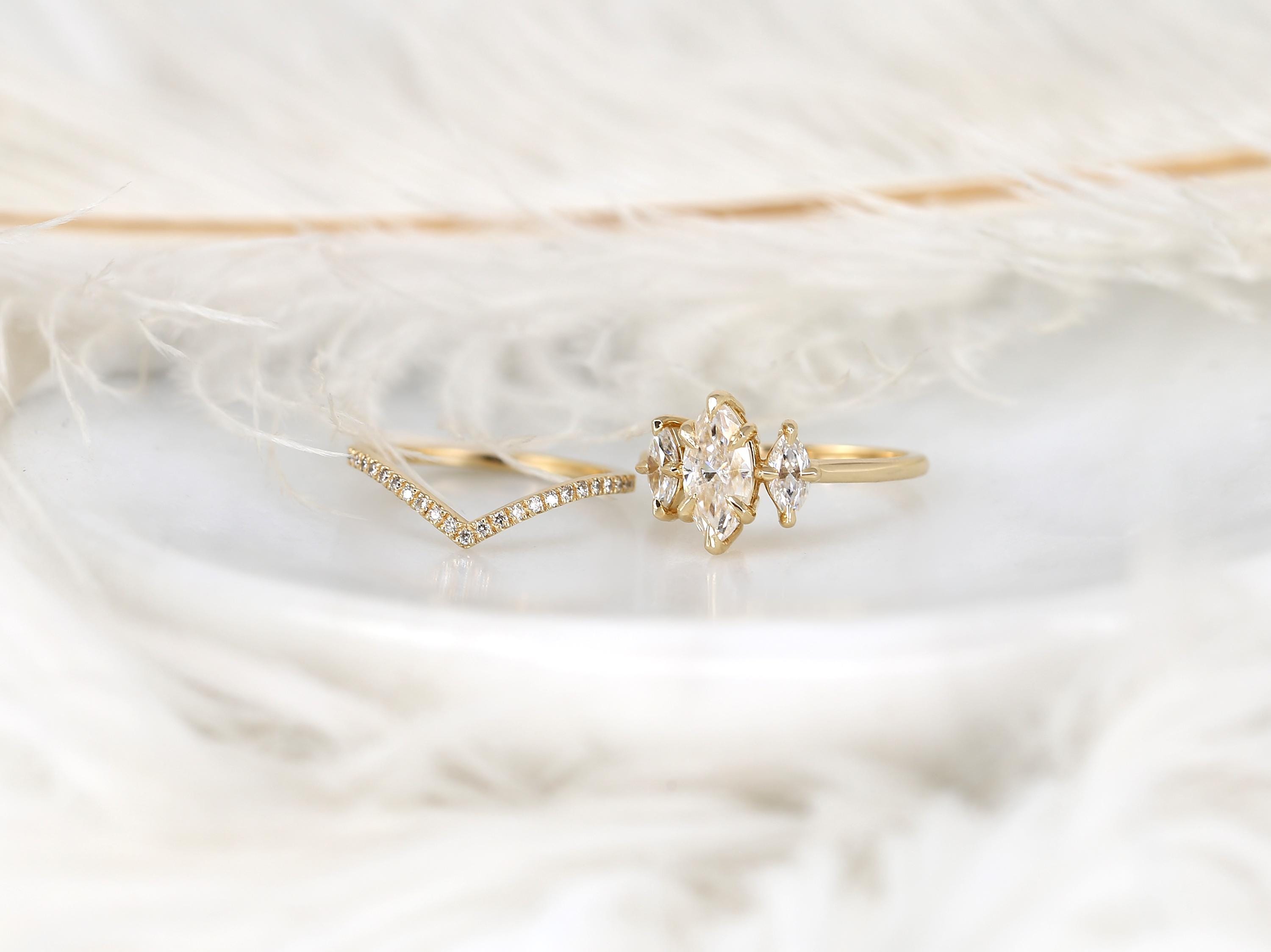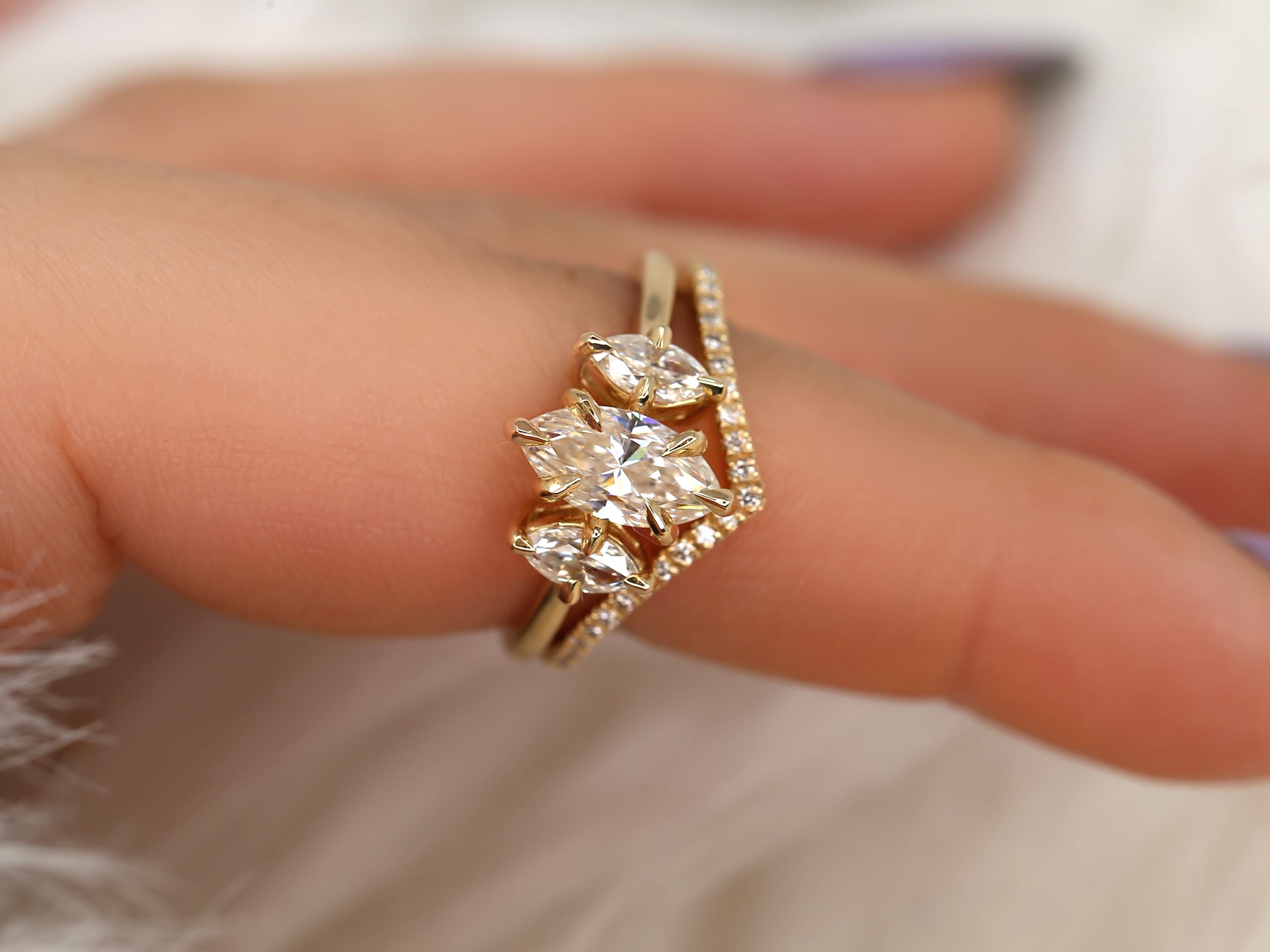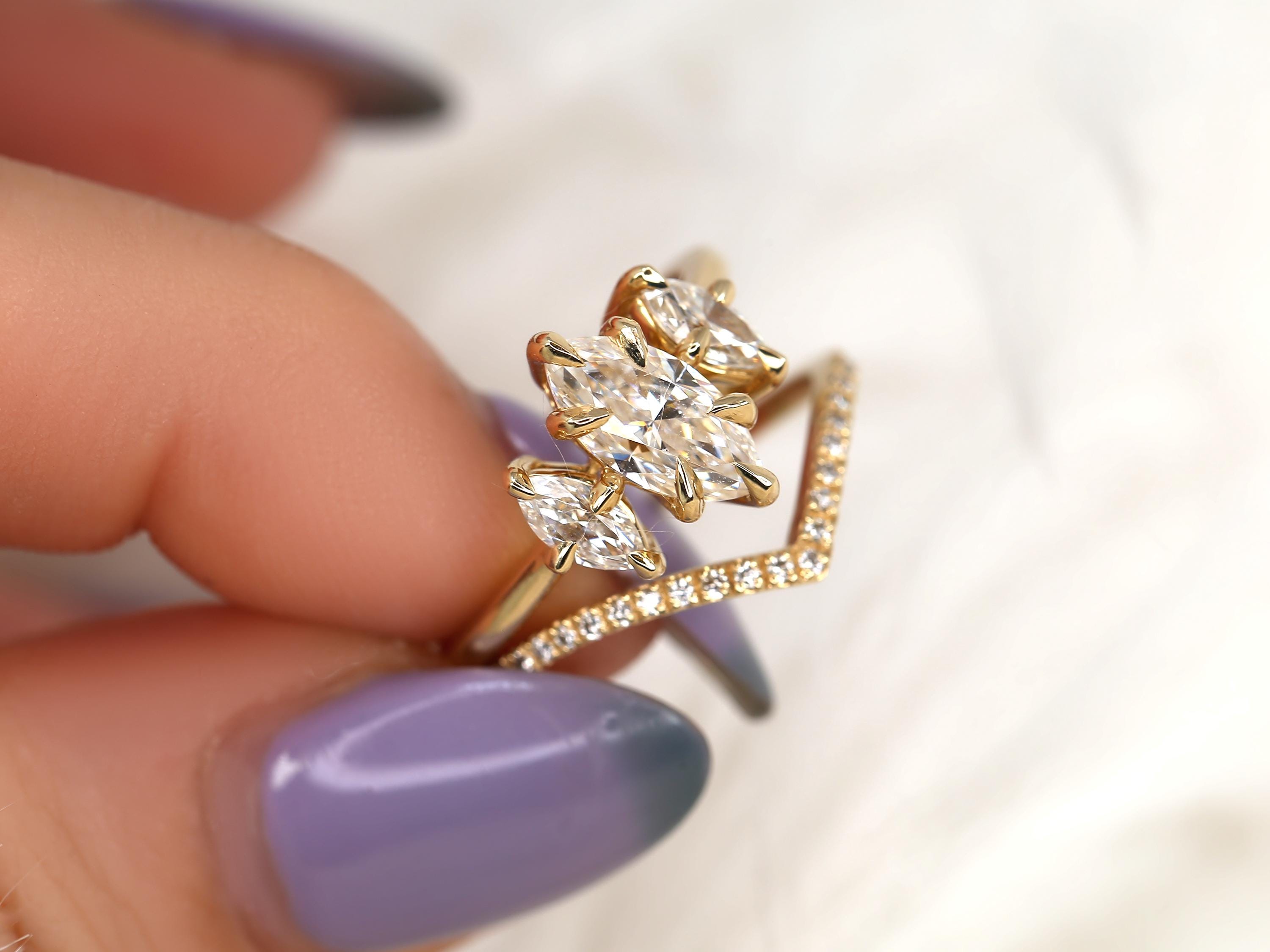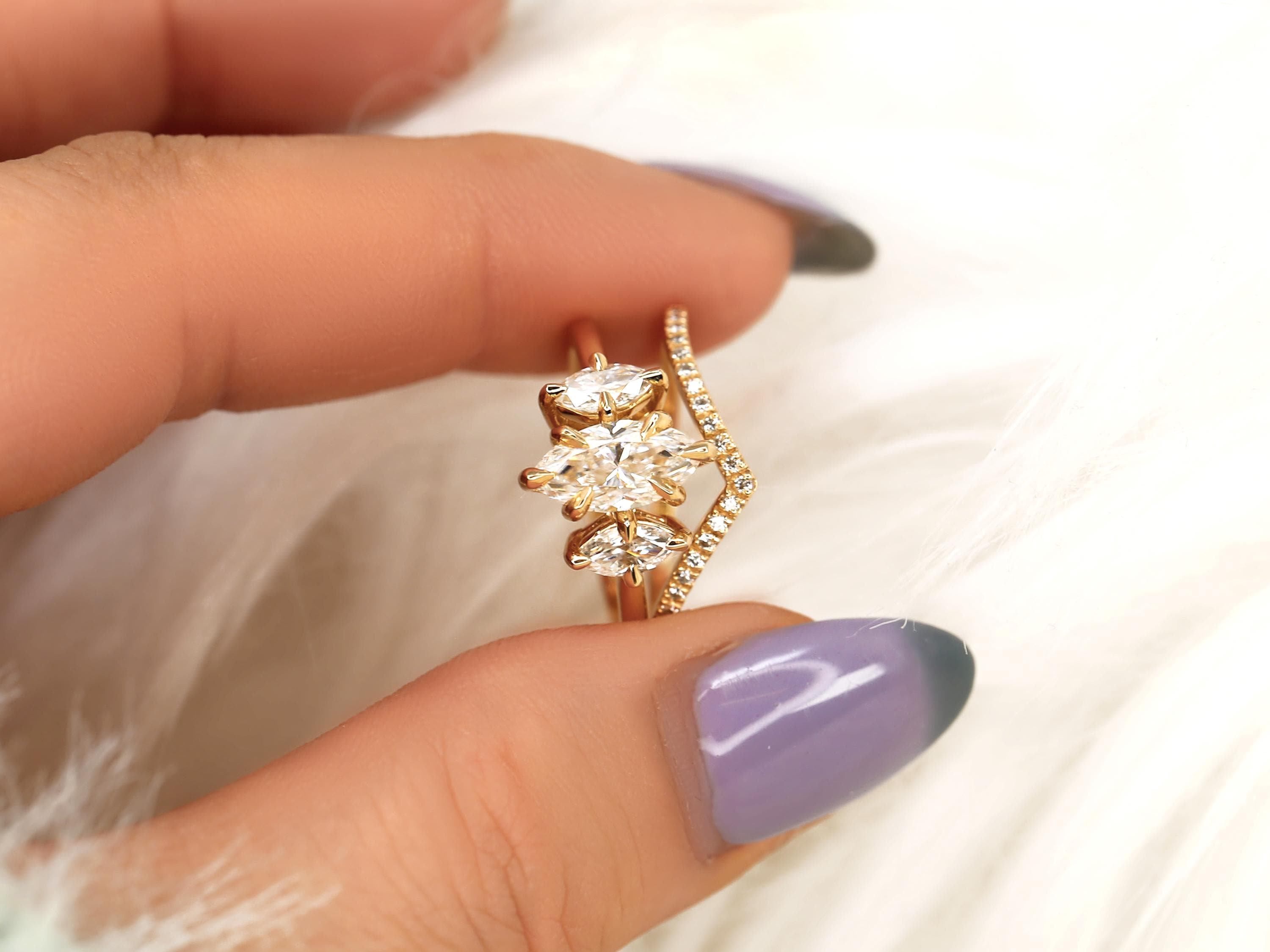 1.50ct Beckett 10x5mm & Chevy 14kt Moissanite Diamond Marquise Three Stone Bridal Set,Marquise Trilogy Wedding Ring Set,Unique Marquise Ring