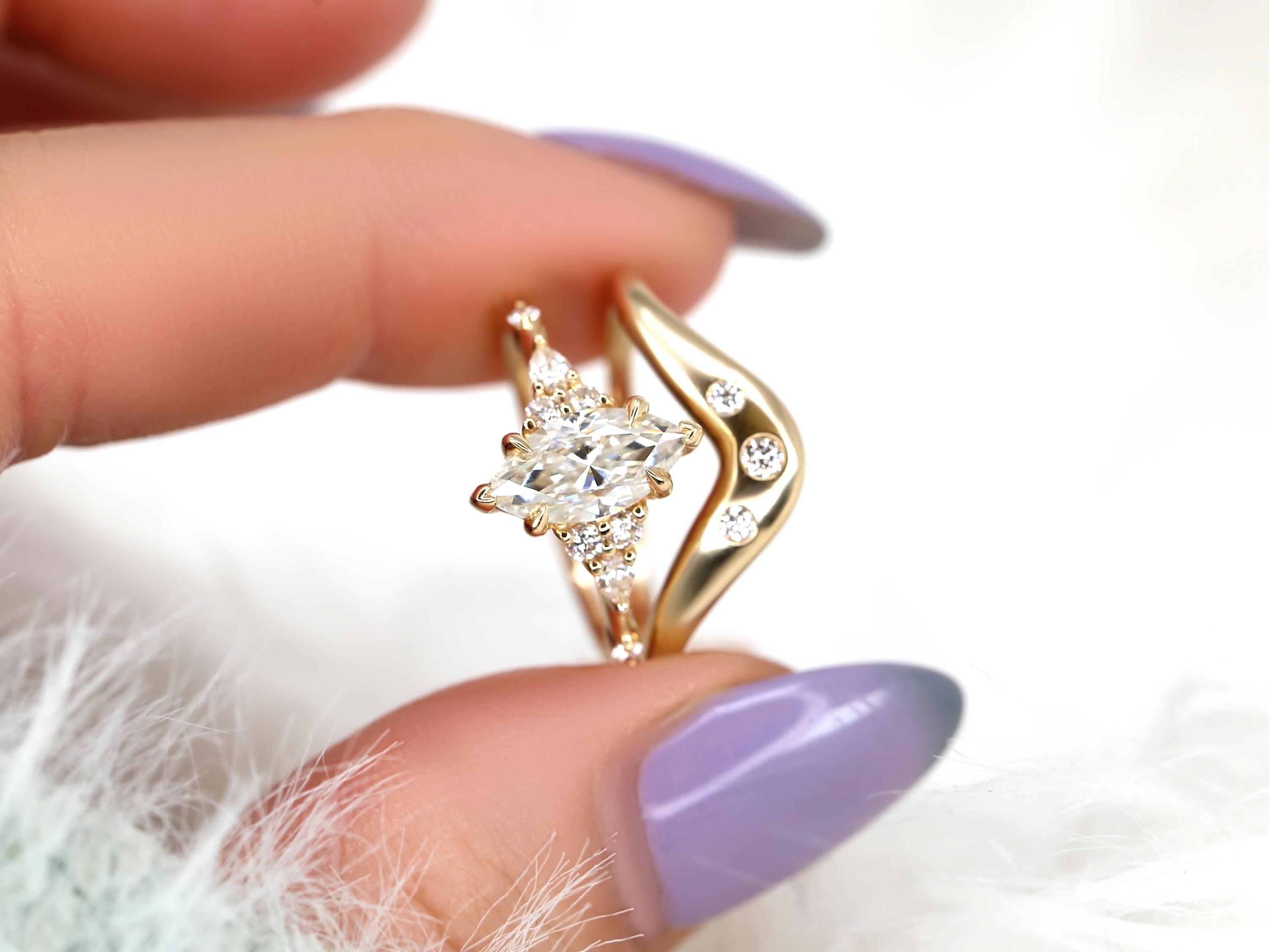1ct Astrid & Tetra 14kt Gold Diamond Marquise Cluster Wedding Ring Set,Dainty Unique Art Deco Ring,Diamond Engagement Ring,Marquise Ring Set
