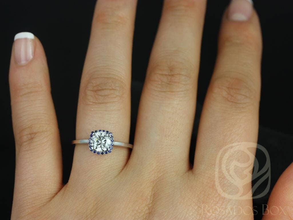 SALE 0.75ct Bella 6mm 14kt White Gold FB Moissanite Blue Sapphire Cushion Halo Ring,Unique Halo Ring,Cushion Wedding Ring,Promise Ring