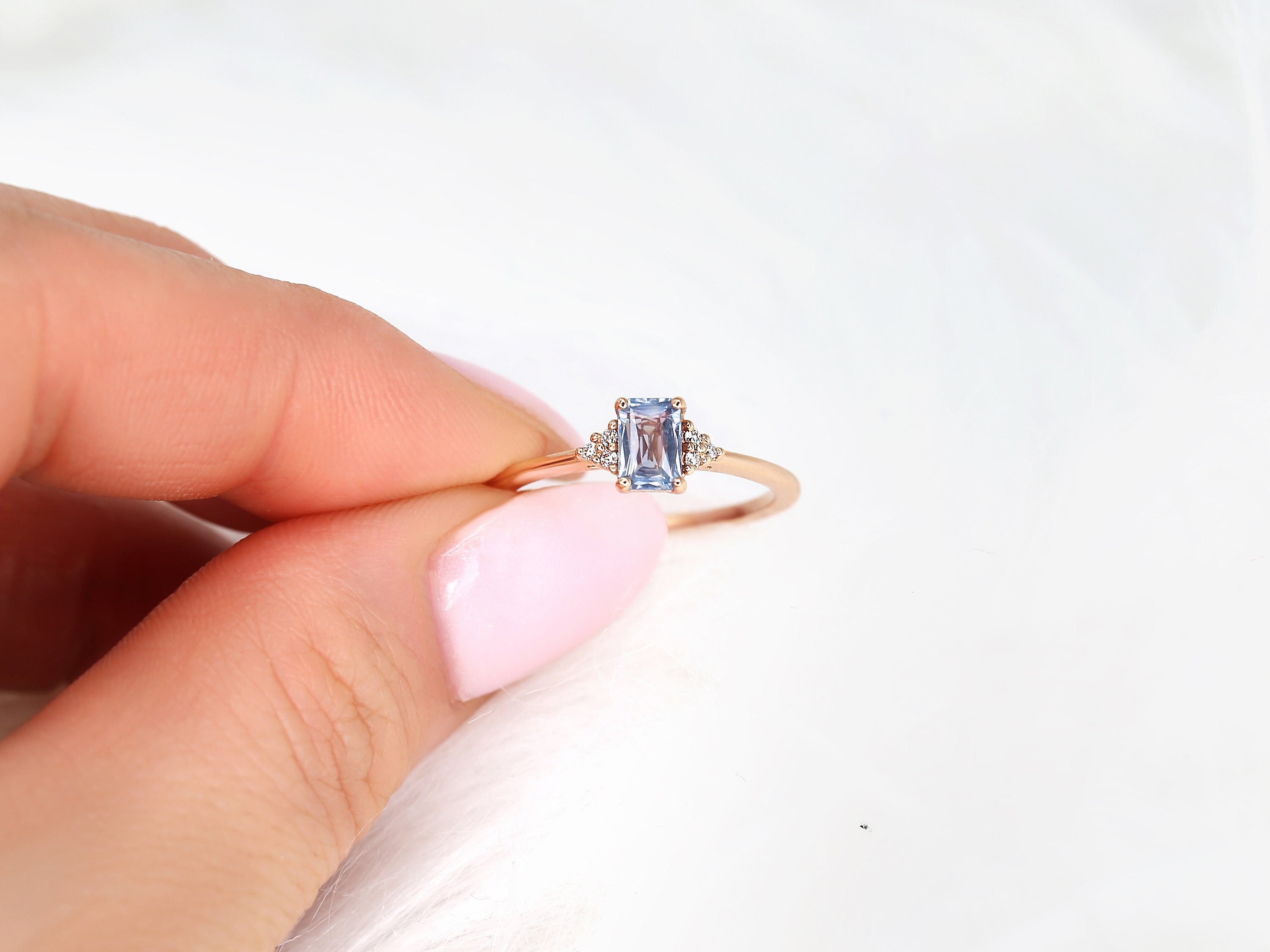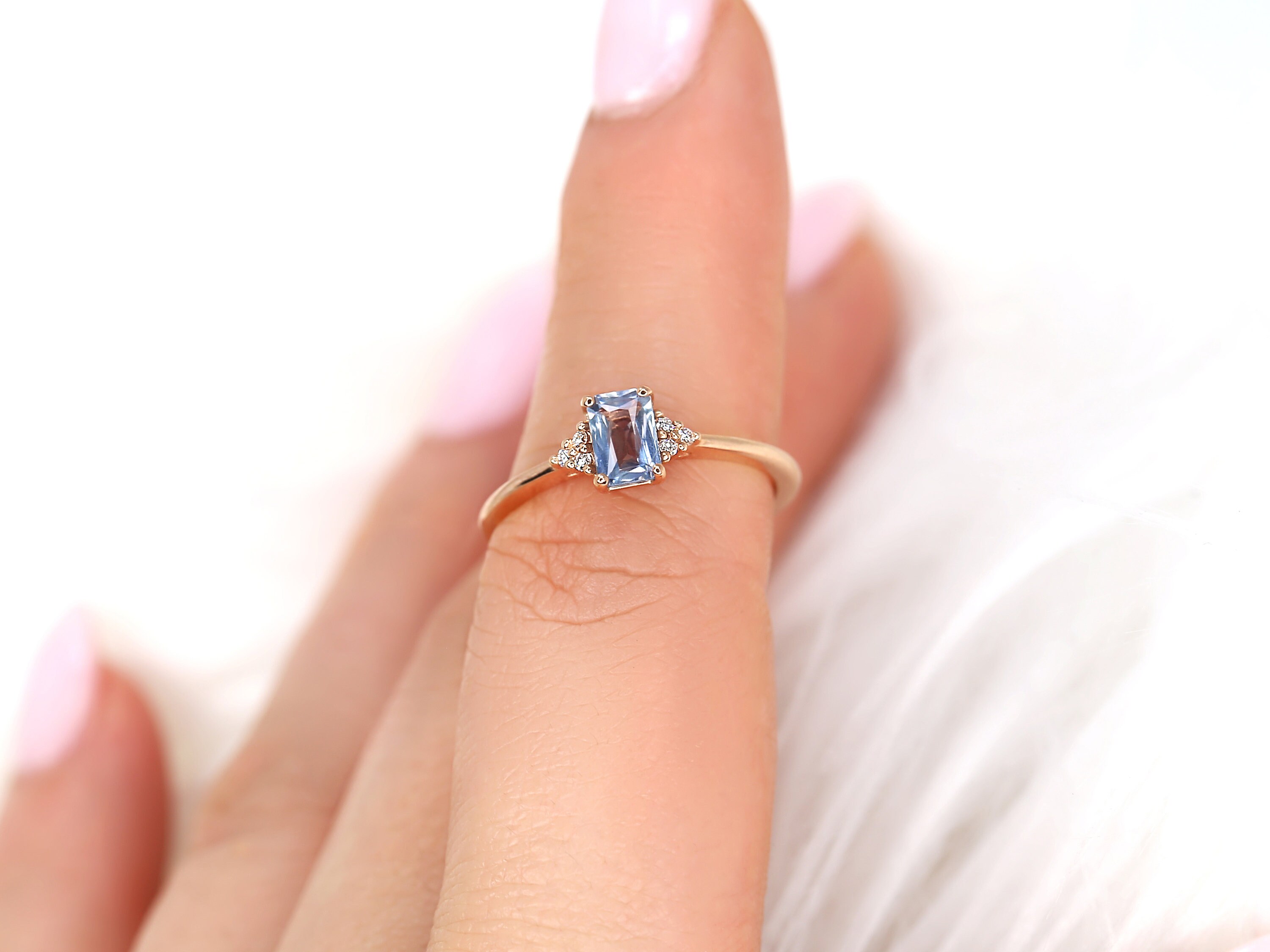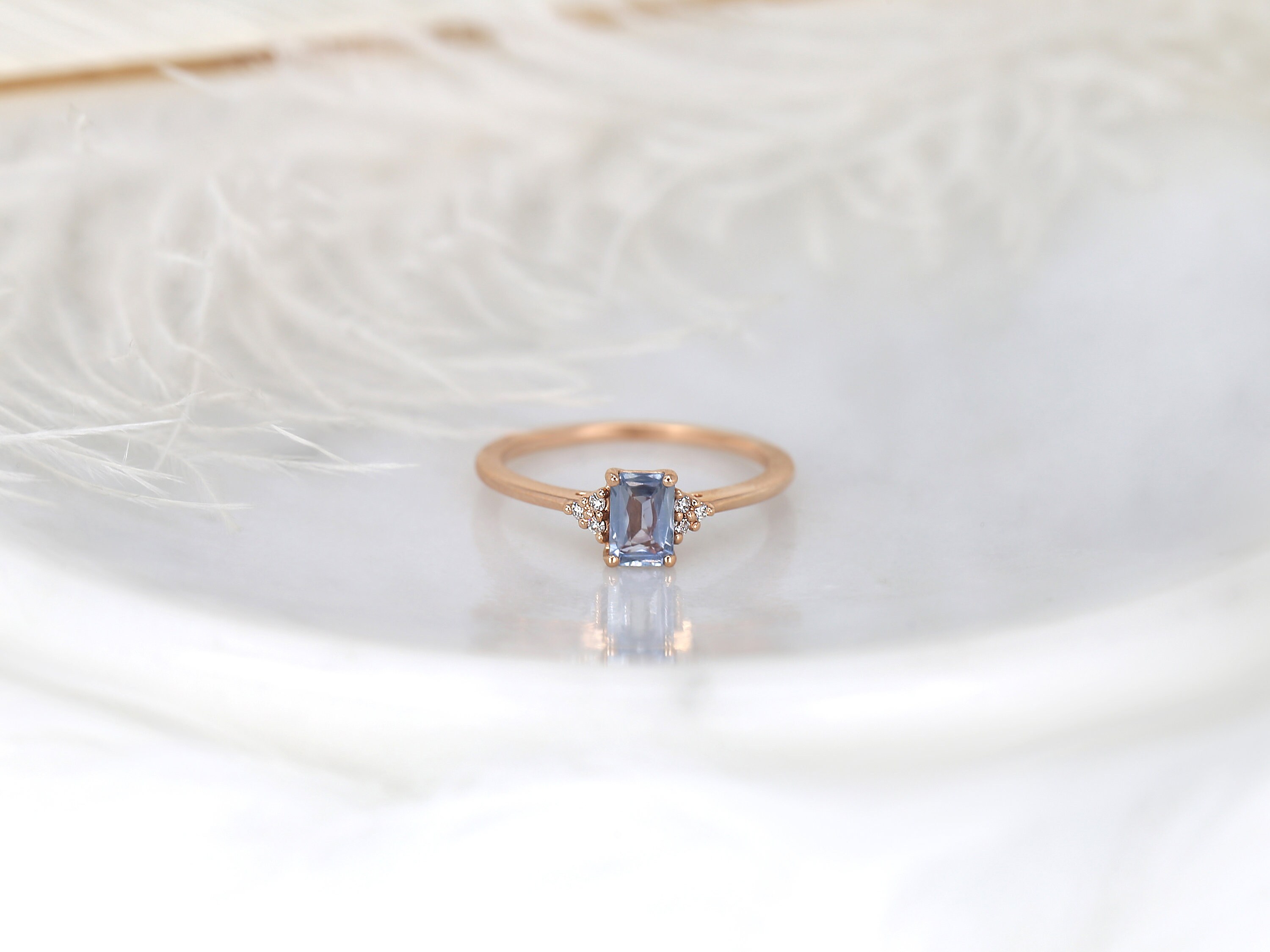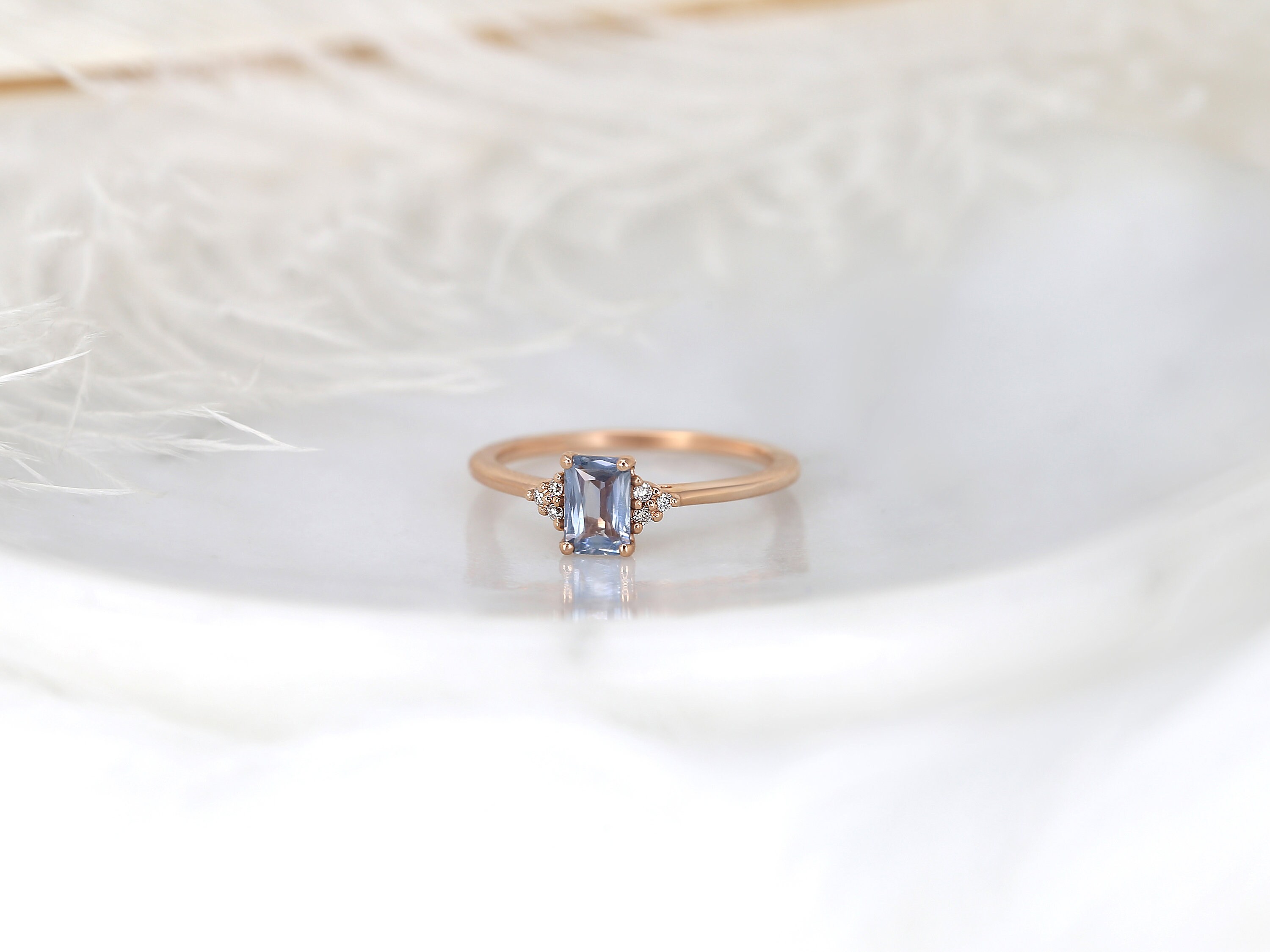 0.64ct Ready to Ship Jada 14kt Rose Gold Cornflower Blue Sapphire Diamonds Dainty Emerald Cluster 3 Stone Unique Ring,Rosados Box