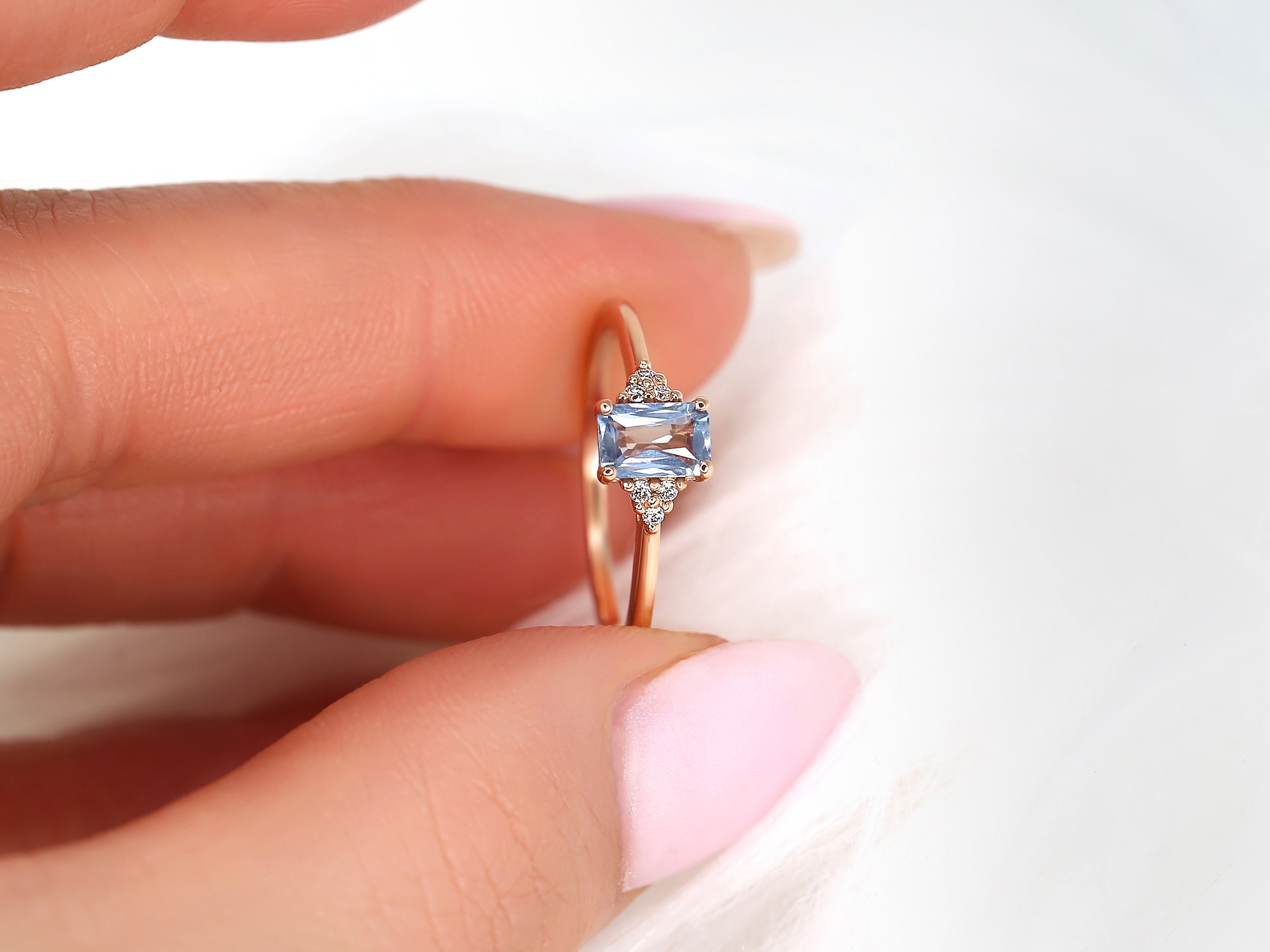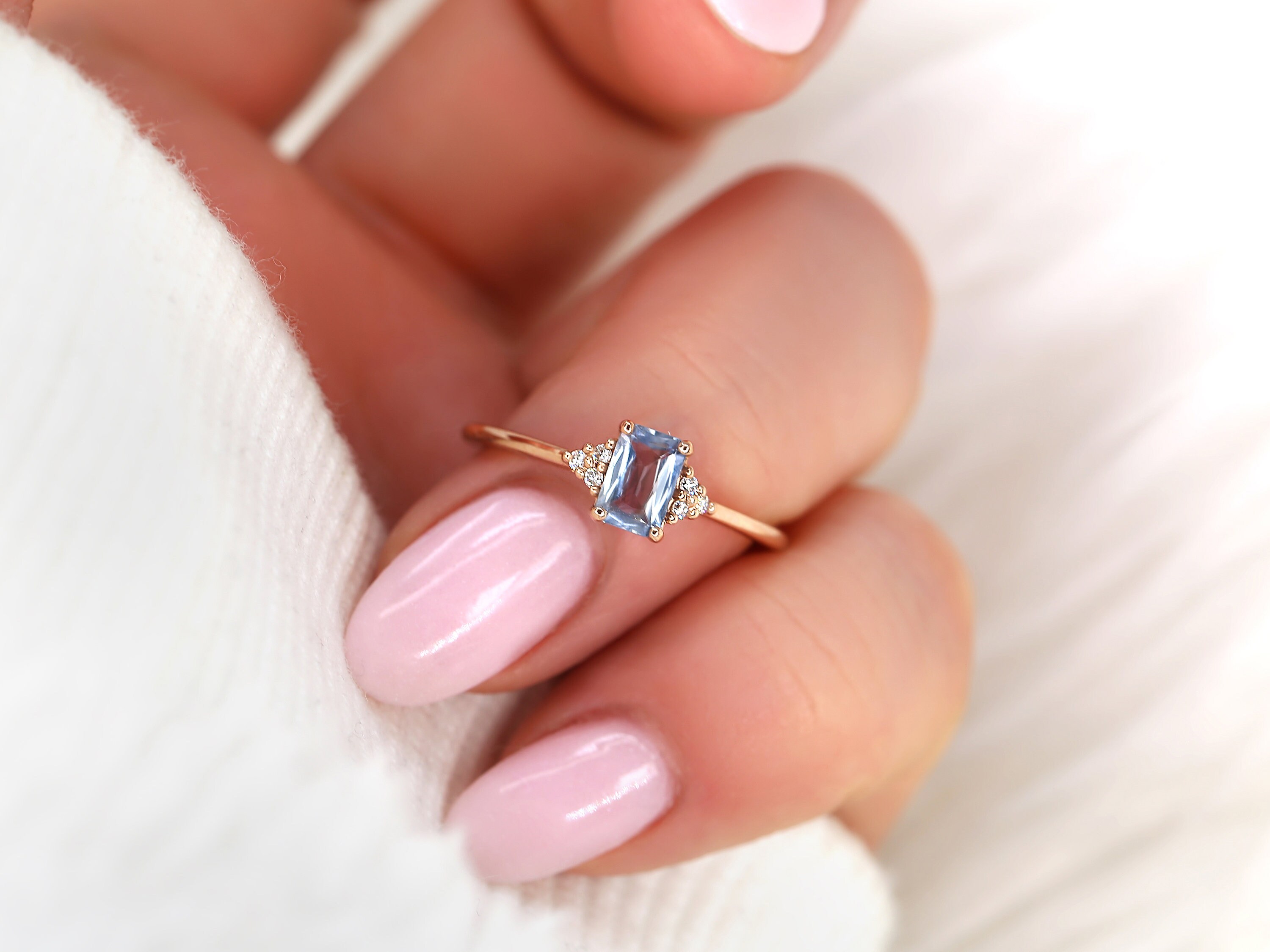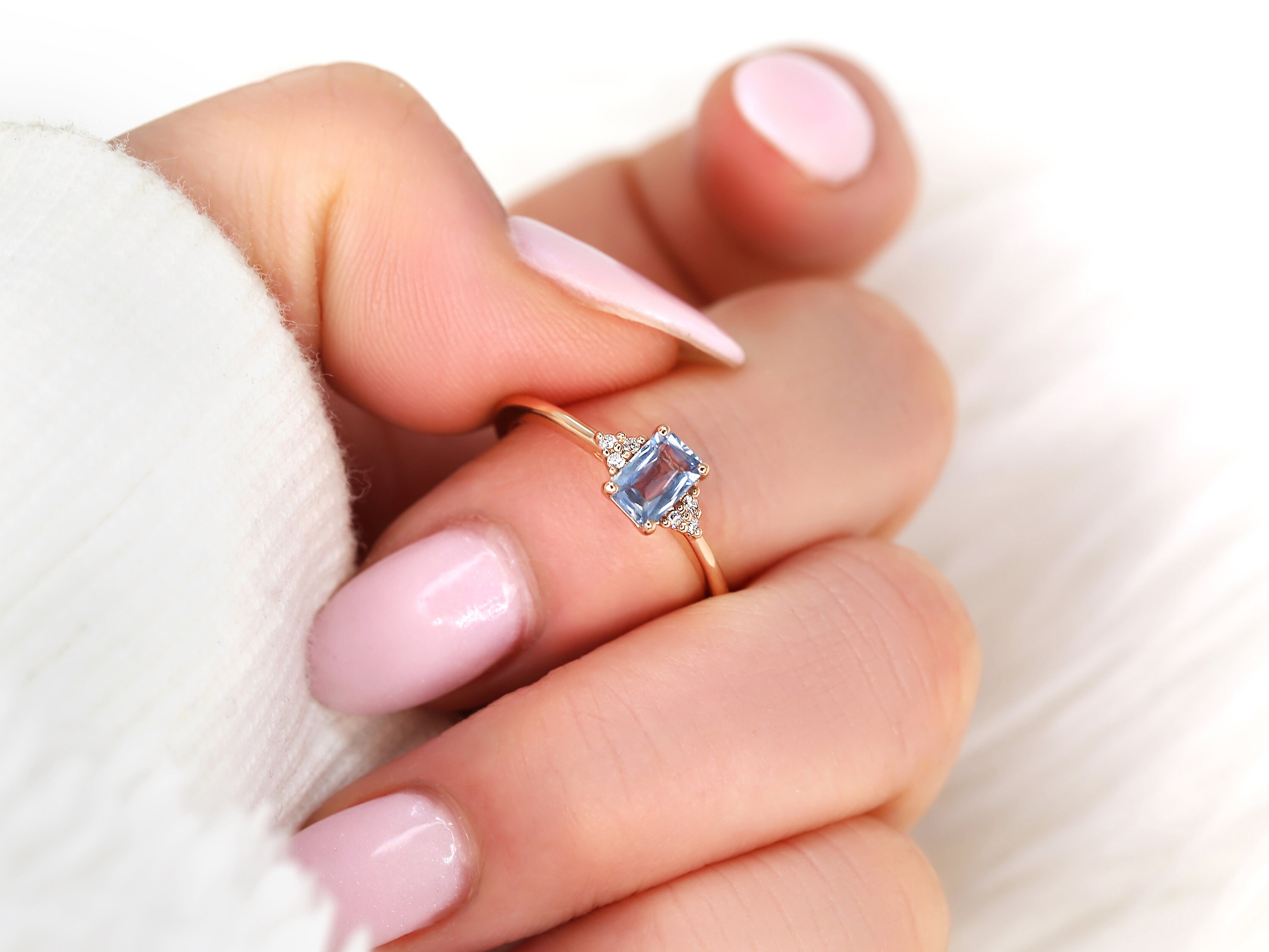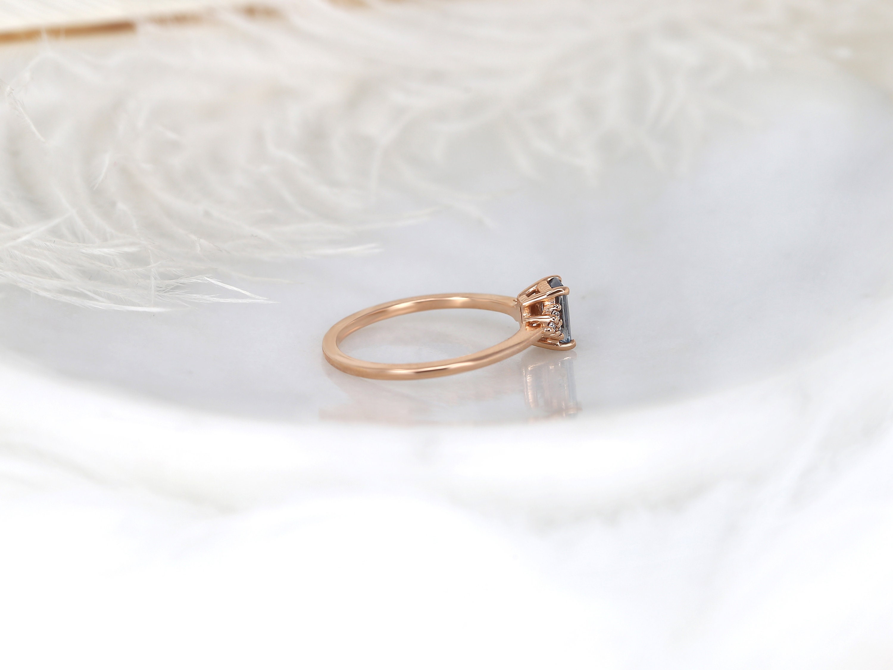 0.64ct Ready to Ship Jada 14kt Rose Gold Cornflower Blue Sapphire Diamonds Dainty Emerald Cluster 3 Stone Unique Ring,Rosados Box