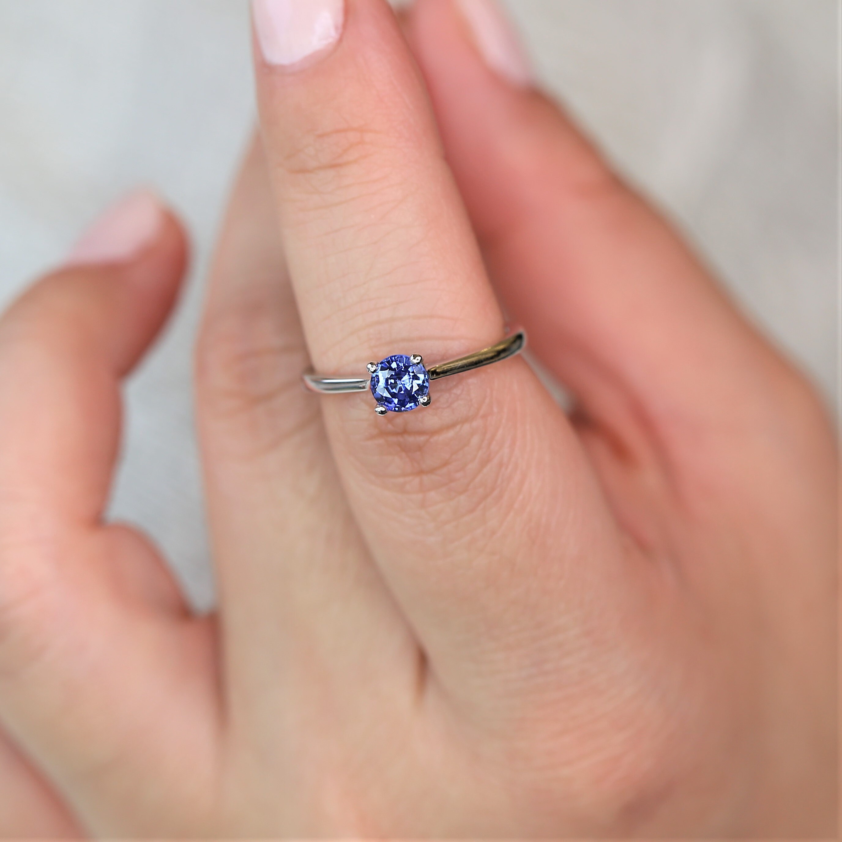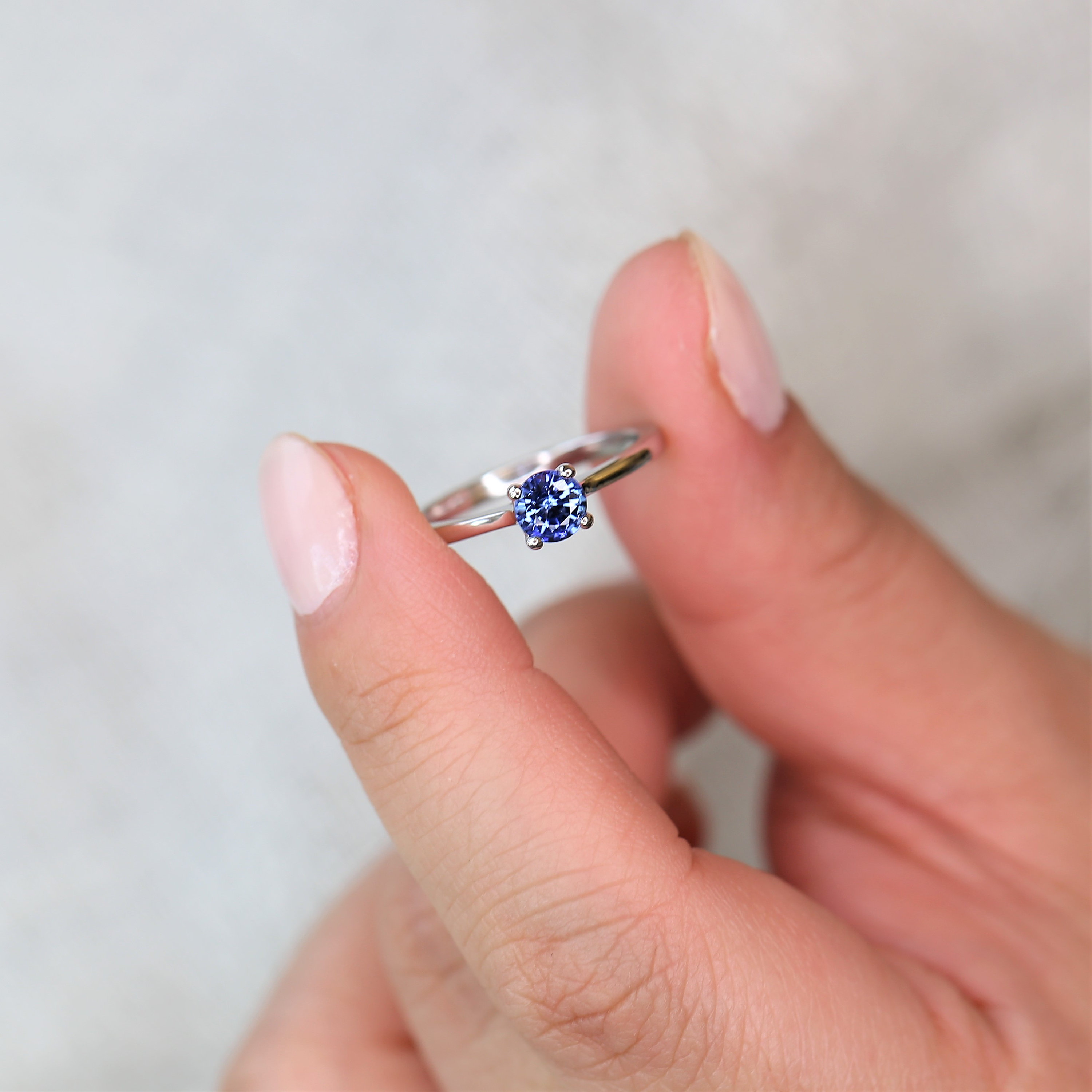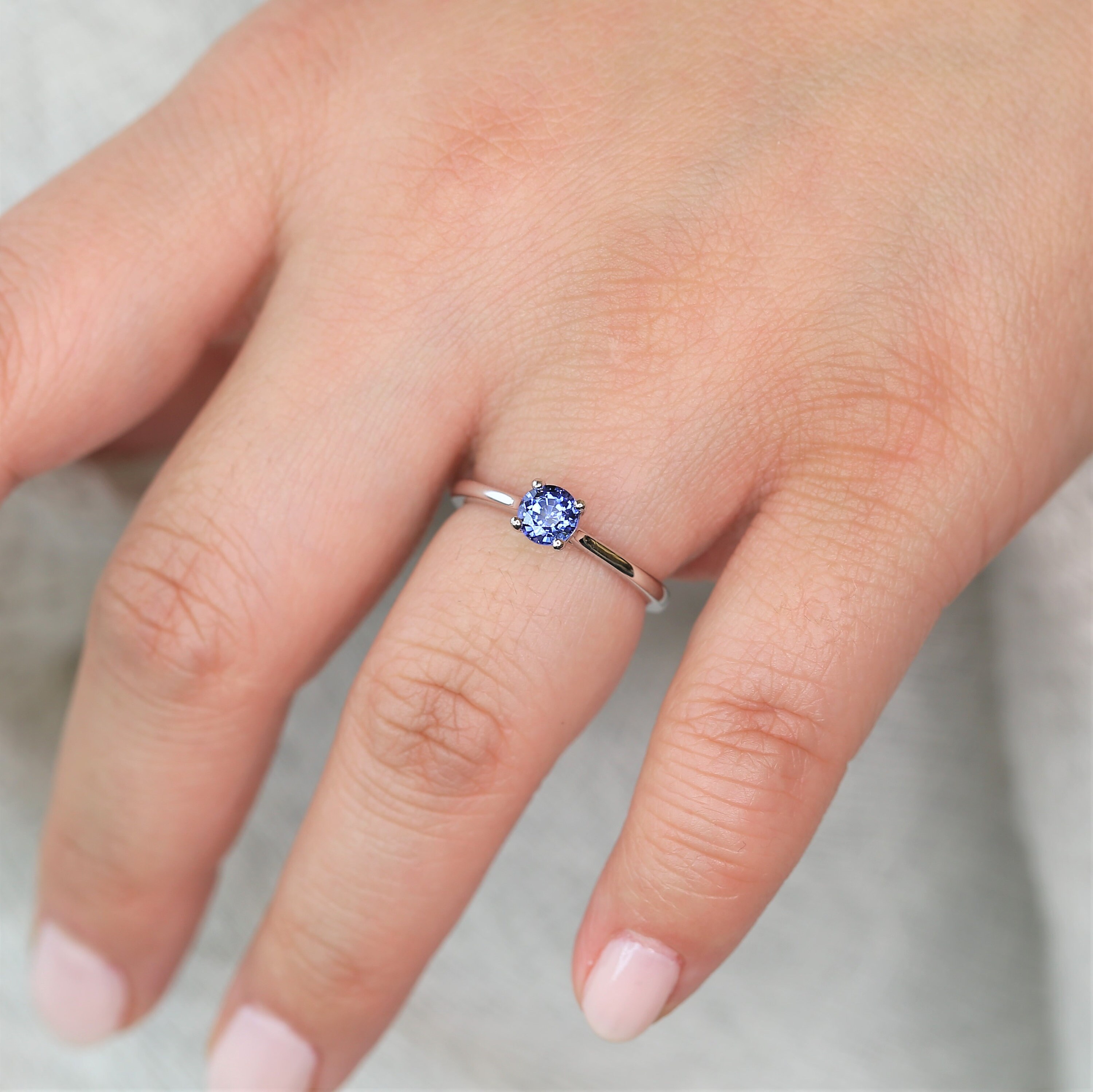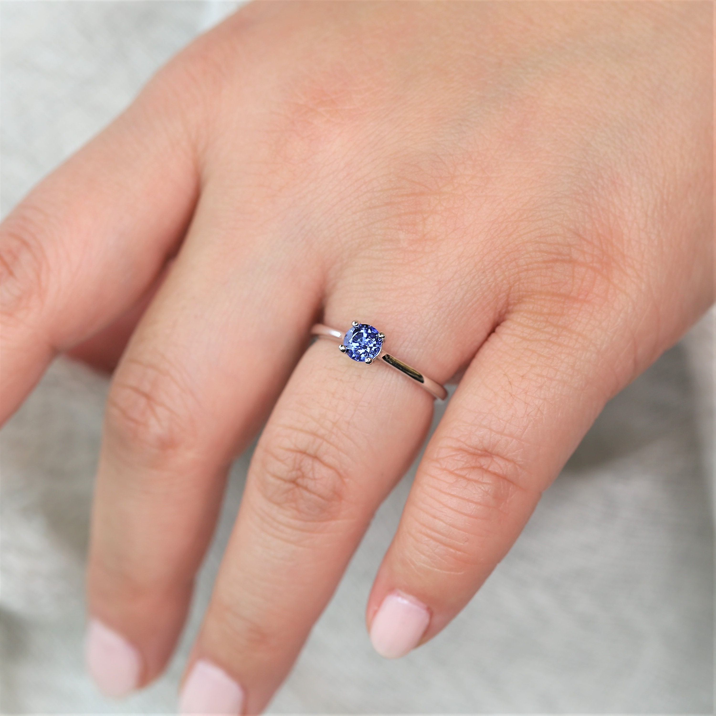 Ready to Ship Skinny Flora 5mm 14kt White Gold Blue Sapphire Thin Cathedral Round Solitaire Engagement Ring,Rosados Box
