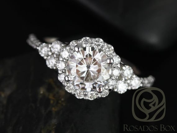 SALE Rosados Box Ready to Ship Samantha 6.5mm 14kt White Gold Round FB Moissanite Diamond Art Deco Halo W/O Milgrain Halo Engagement Ring